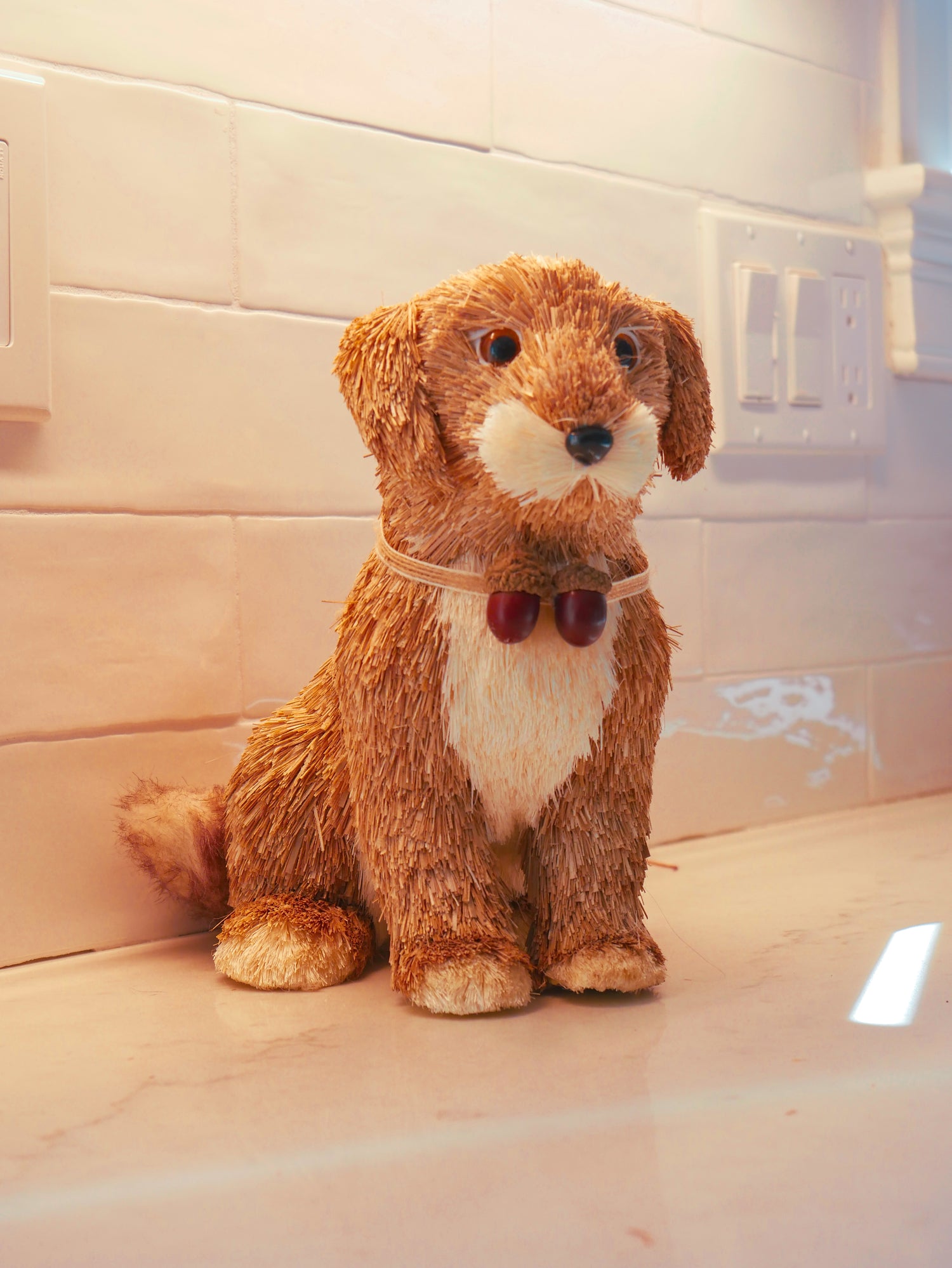 This 10" Sisal Grass Puppy Dog makes a perfect addition to any home decor. Crafted from natural sisal grass, the puppy features an acorn necklace and tan and white accents. Perfect for adding a soft, natural touch to any room.