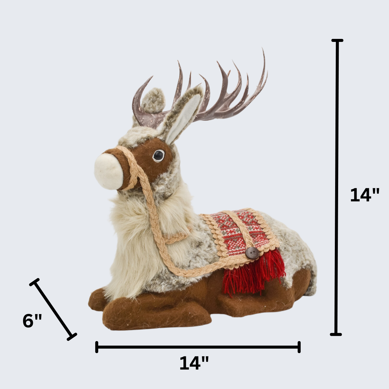 Bring classic holiday charm to your home with the 14" Regal Reindeer. Accurately detailed with a silky faux fur body, festive saddle cloth, and braided twine bridal and reins, this decorative laying reindeer is perfect for adding a touch of winter decor to your home.