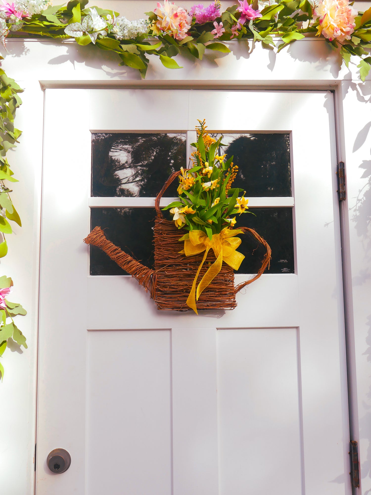 This sweet 15" Liatris and Daisy Watering Can is a perfect way to brighten Mom's day with a burst of sunshine! Featuring yellow Liatris and Daisy blooms, it's topped off with a sunny yellow bow and set in a rustic grapevine watering can. Delightful wall or door décor!