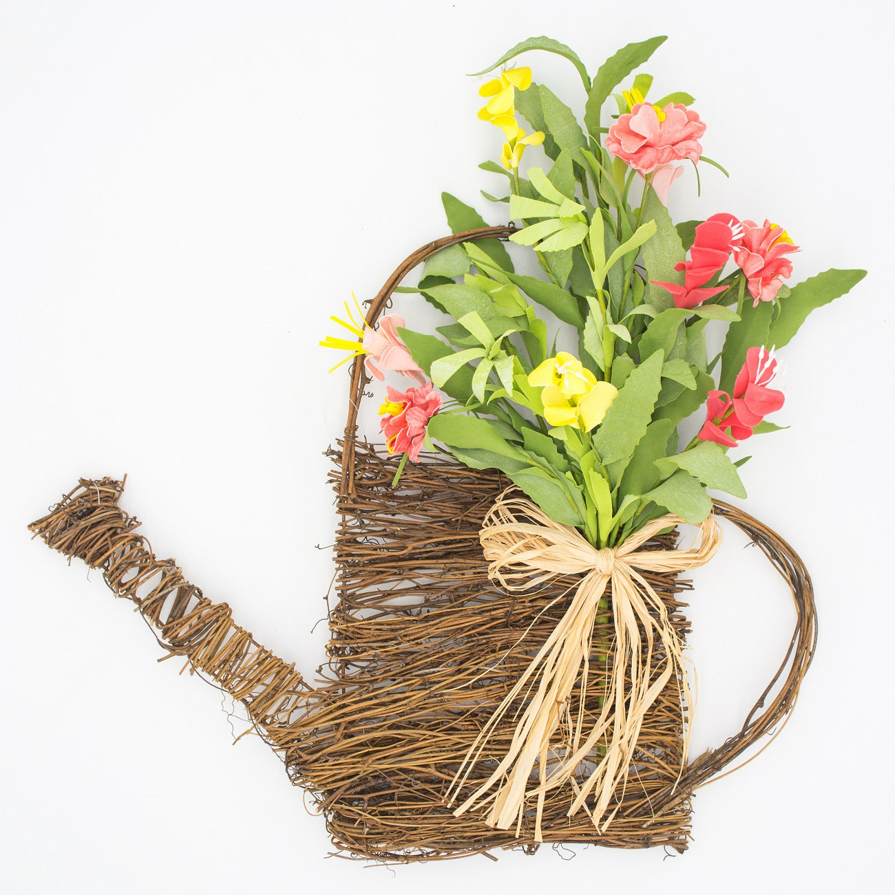 Add a splash of color to your Mothers Day celebration with our 15" Peach Blossom Watering Can! Crafted from a grapevine base with a raffia bow, this fun piece of wall or door décor is sure to delight with its cheerful, peach blossom design. It's a unique way to show mom you care!