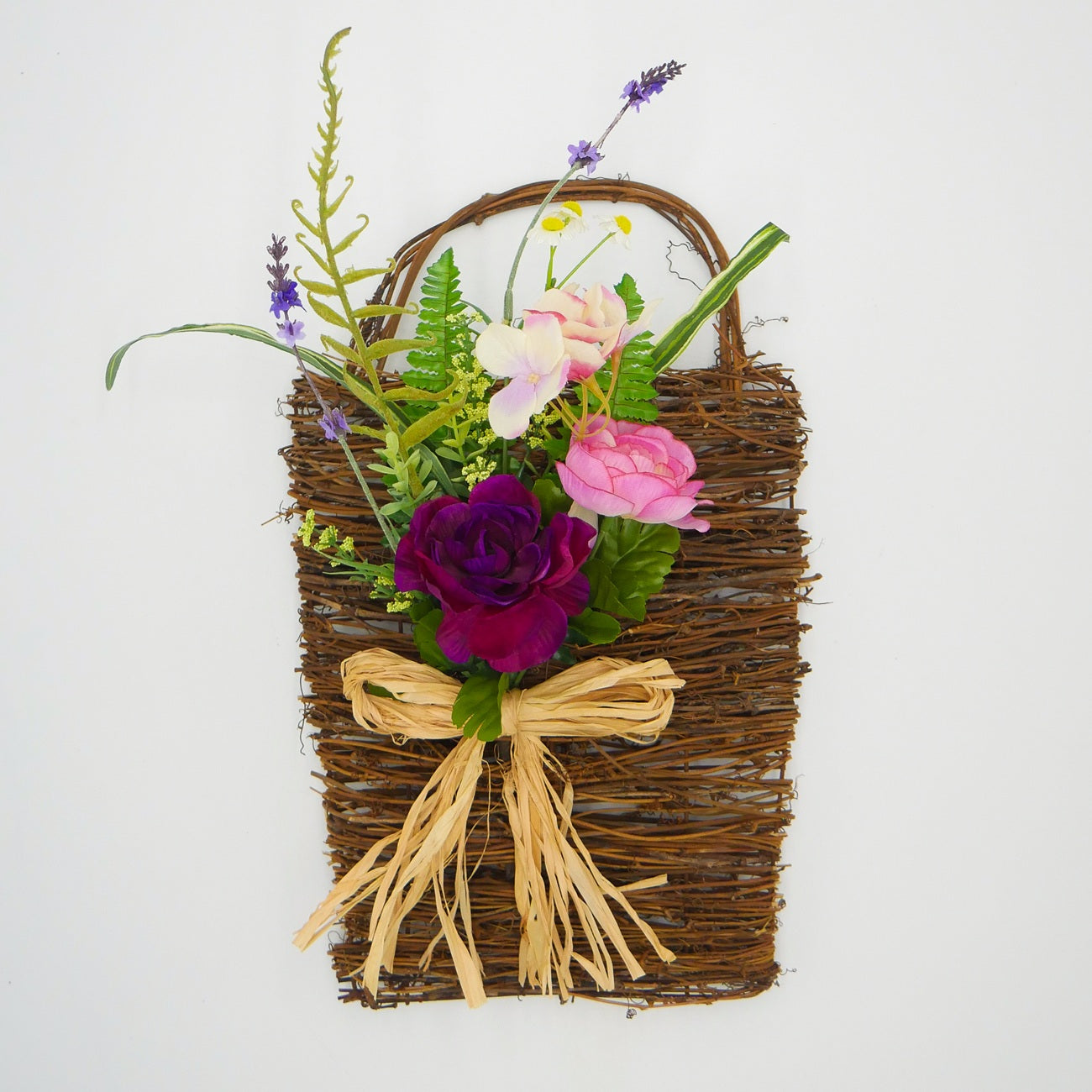 Floral Living is proud to announce our 16" Purple Camellia 3-D Wall Basket, featuring a grapevine woven design and a charming raffia bow. Perfect for adding a touch of spring to your home, wall or door decor. Crafted with purple a camellia and wildflowers, this watering can brings a beautifully natural element to any space.