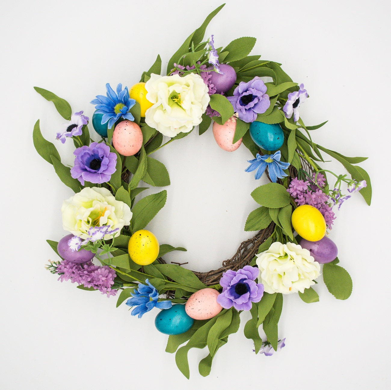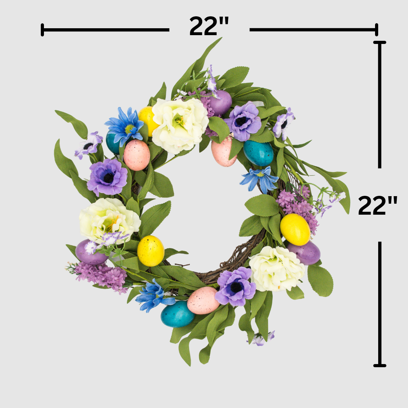 This egg-citing 22" Easter Egg Wreath is the perfect way to celebrate the season! Crafted with high-quality Easter eggs, lilac, begonias and anemones on a grapevine base with a wire loop for hanging, this wreath will add a cheerful touch of Easter décor to any home.