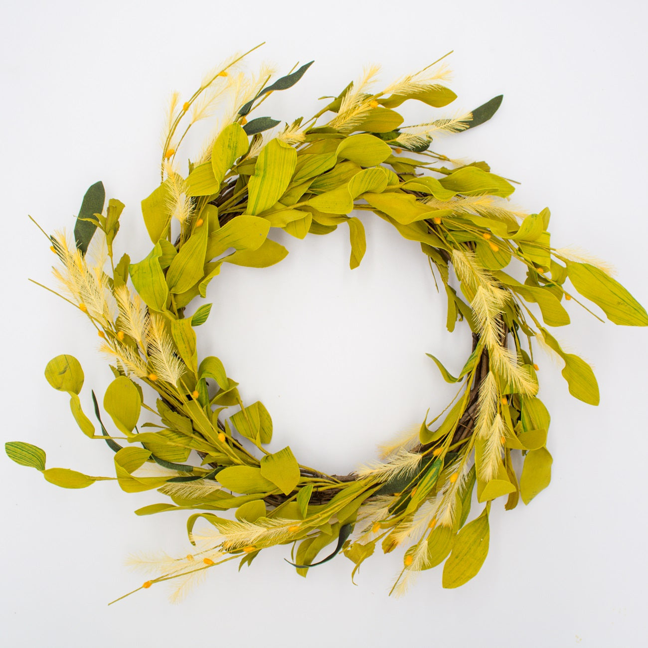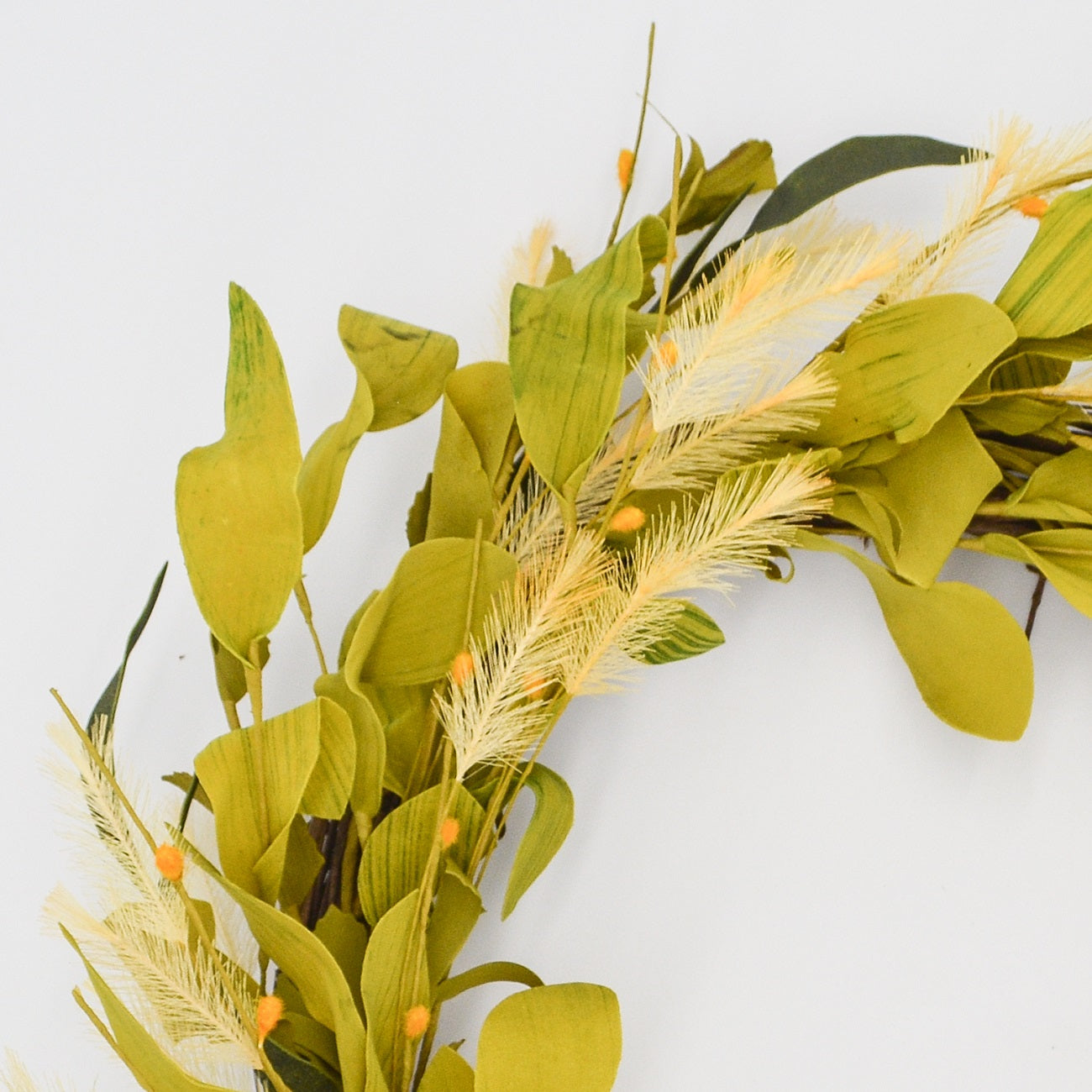 Our 22" Field Grass Leaf Wreath captures the essence of autumn, boasting an abundance of fall-colored grasses and leaves artfully attached to a rustic grapevine backing. Finished with yellow berry accents, this nature-inspired wreath is the perfect addition to your fall décor, providing a simple, yet elegant look that will last through the season.