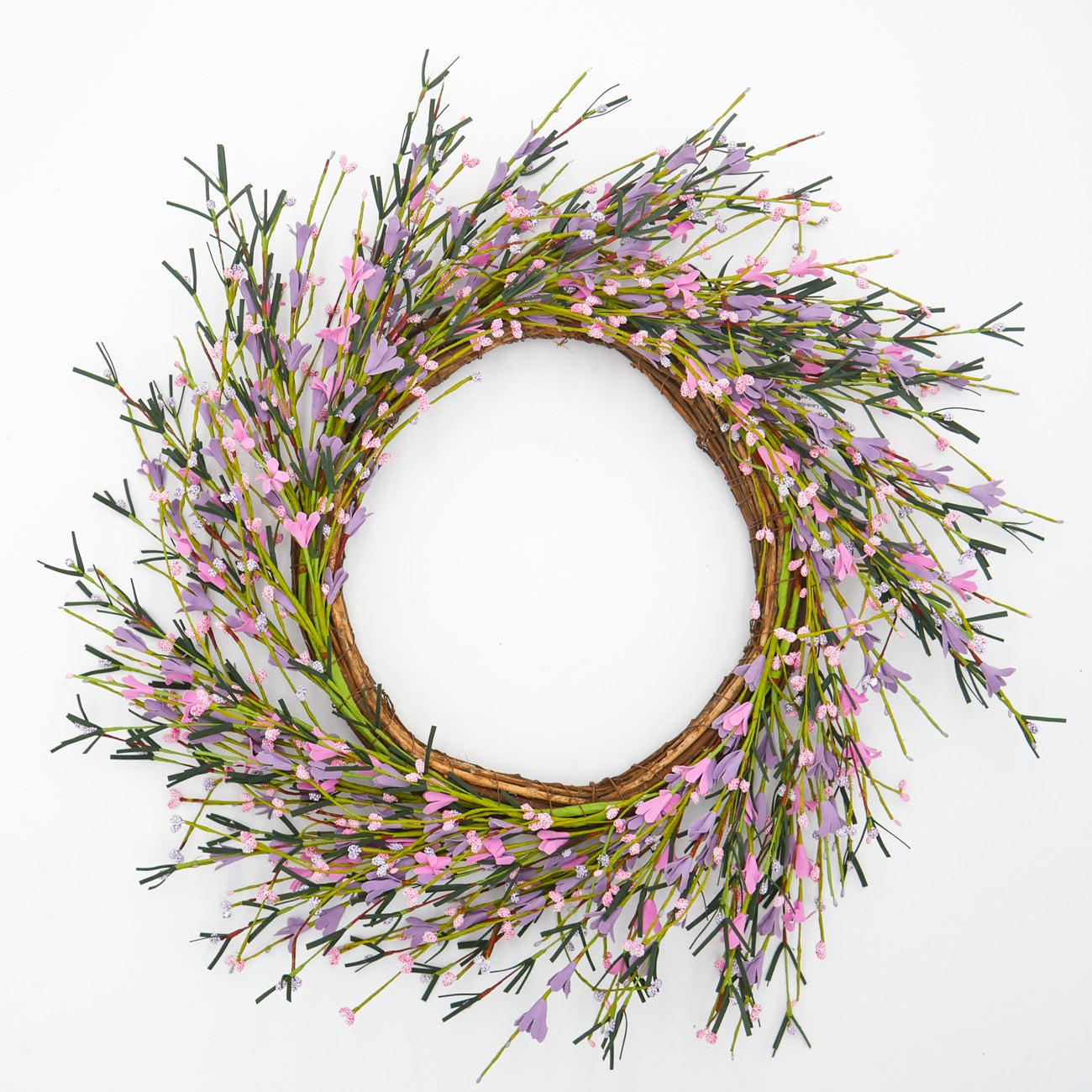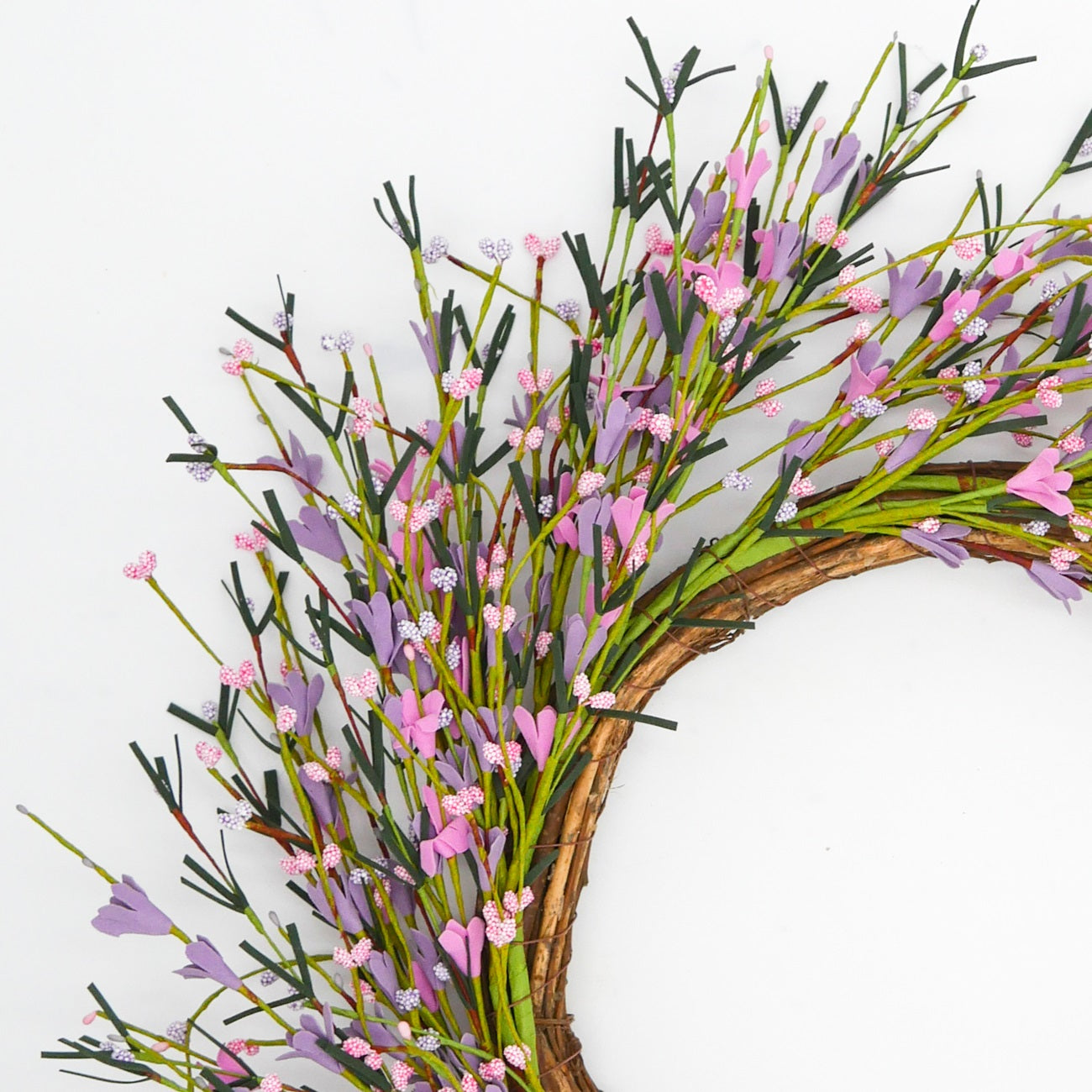 Infuse your home with the vibrant colors of spring with our 22" Lavender and Pink Buttercup Wreath. Featuring beautiful lavender and pink blossoms, this wreath is the perfect addition to your spring décor. The grapevine base adds a rustic touch, creating a charming and welcoming atmosphere.