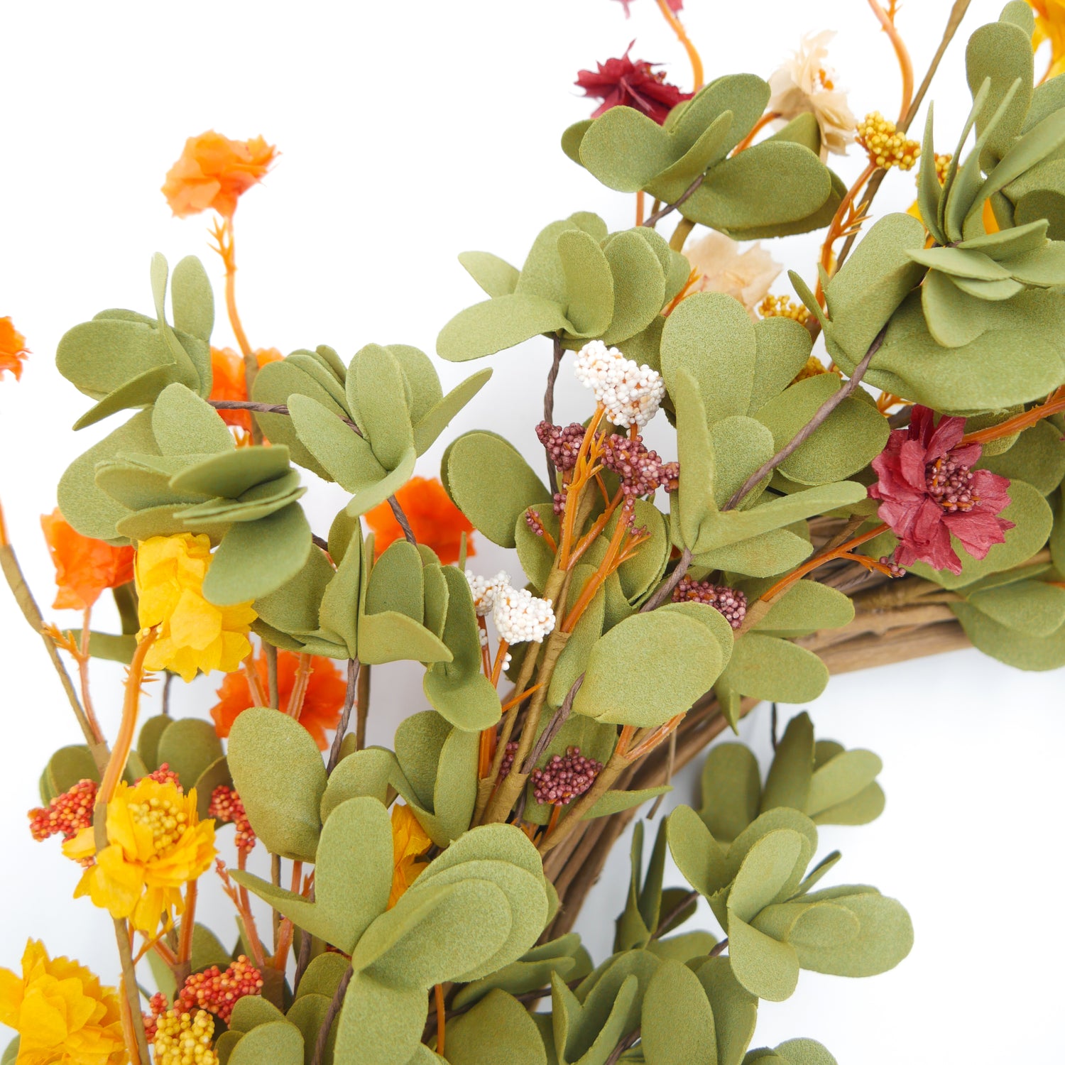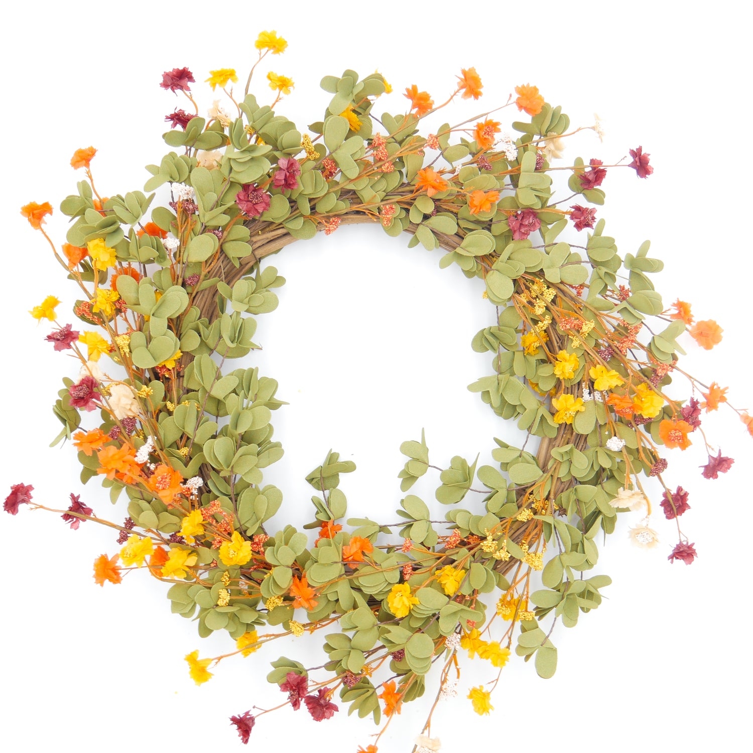 This 22" Marigold Eucalyptus Wreath features a grapevine base adorned with vibrant faux marigold and eucalyptus, perfect for adding a touch of fall decor to any space. Handcrafted with care, this wreath is a beautiful and natural addition to your home.