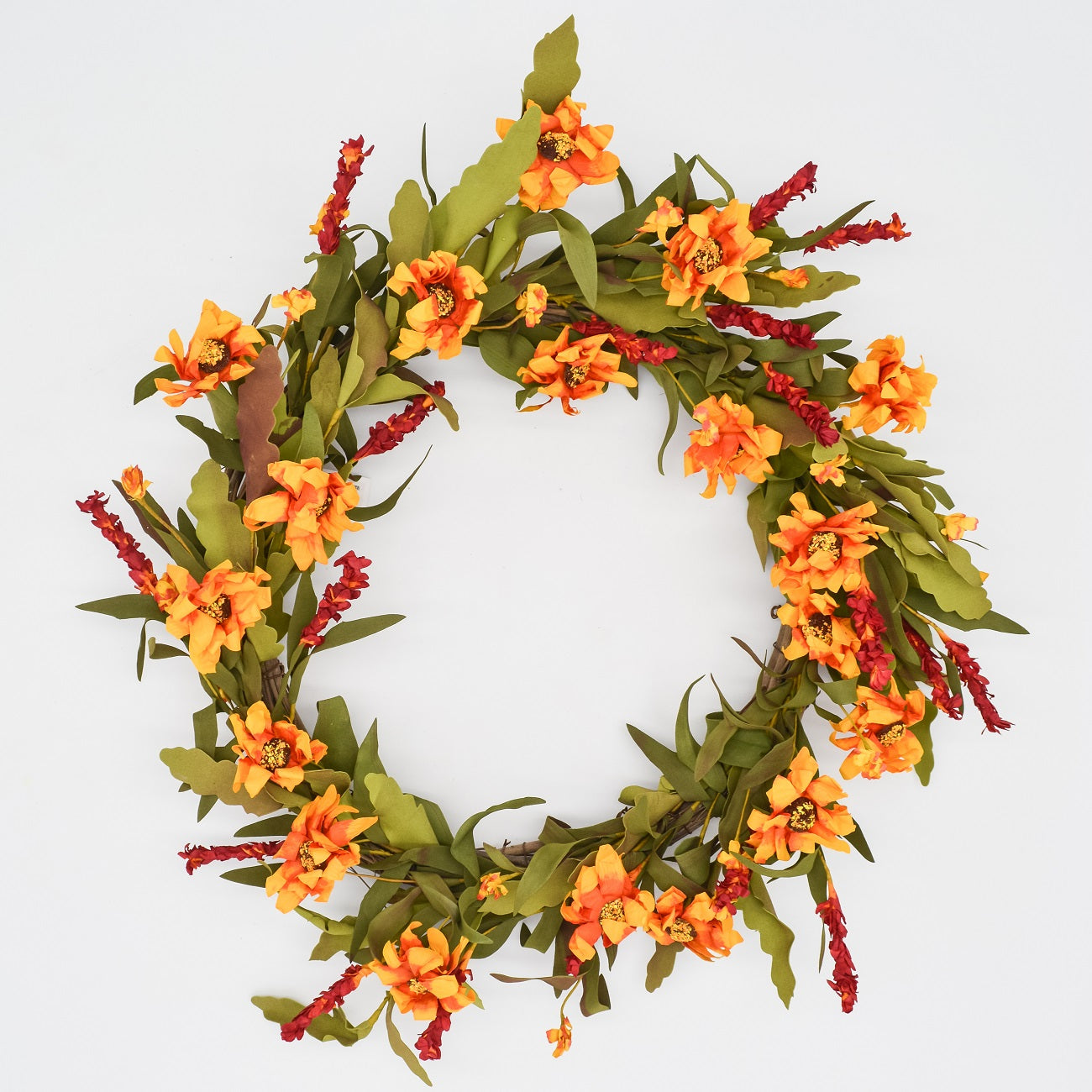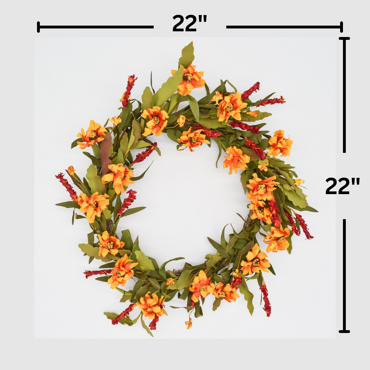 This 22" Coreopsis Wreath is the perfect accent to any home décor. Its grapevine base is adorned with bright orange and red Coreopsis flowers, creating a striking fall display. The wreath is made from high-quality materials for a long-lasting and beautiful finish.