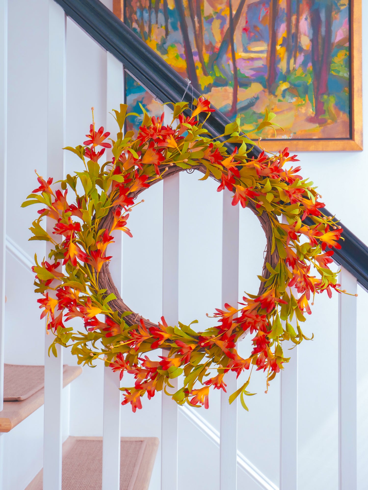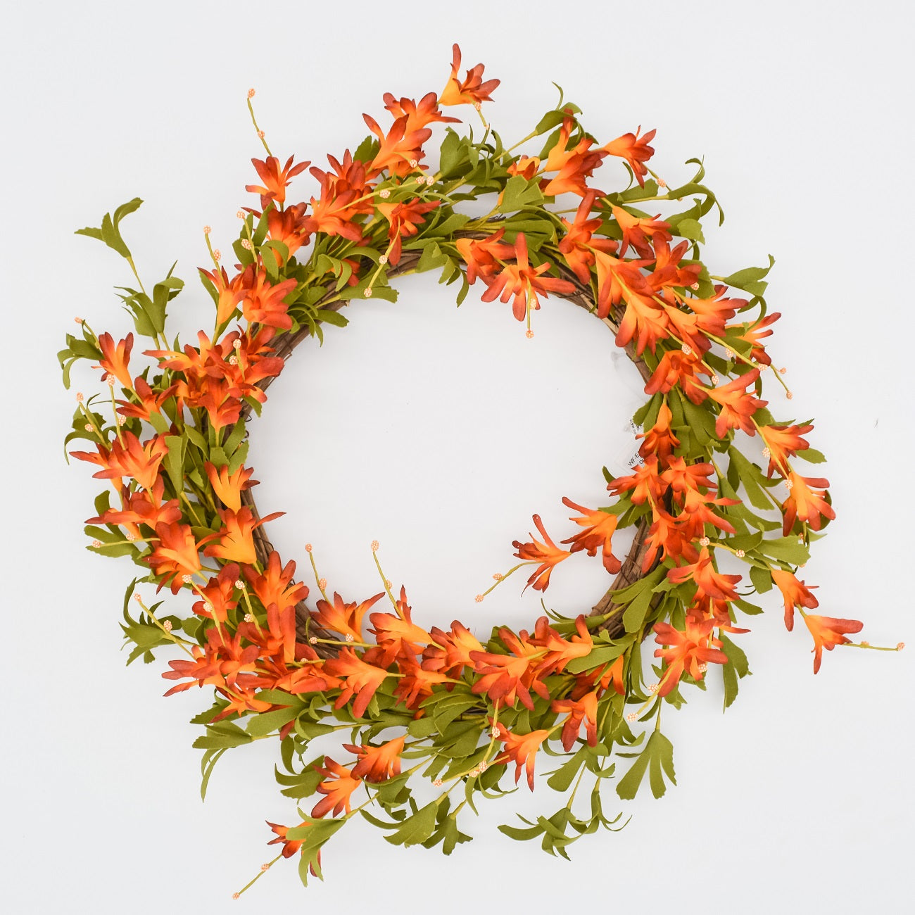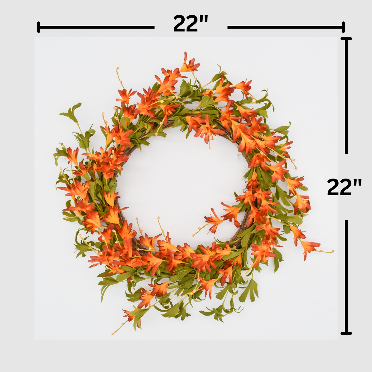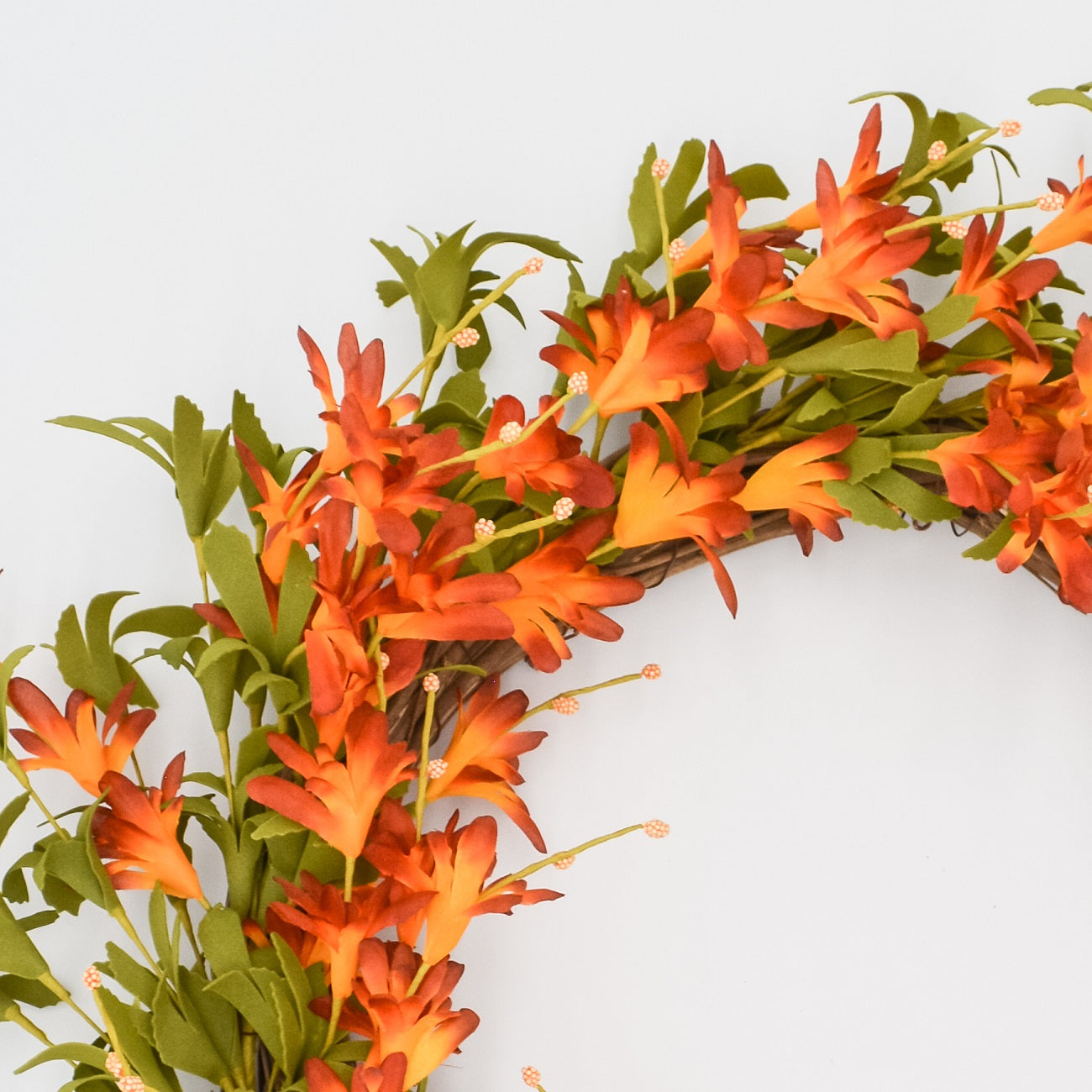 This 22" Orange Trumpet Vine Wreath brings a bright burst of color with its vibrant orange tones. Designed with a grapevine base, and a beautiful mix of florals, this wreath is perfect for capturing the fall season with its autumn decor. Add a welcoming and festive touch to any room.