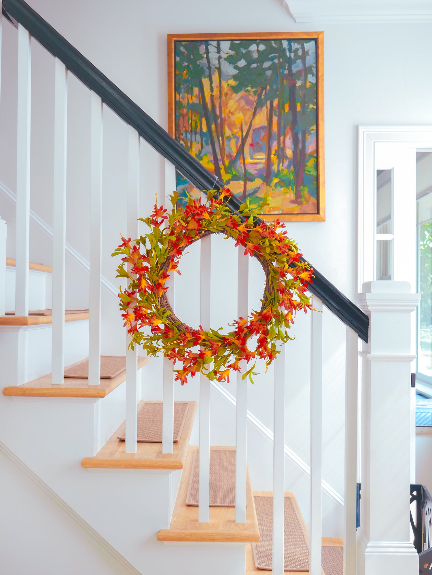 This wreath comes ready to hang with a wire hanging loop attached to the base, giving the nail, hooks, and hangers a place to attach.