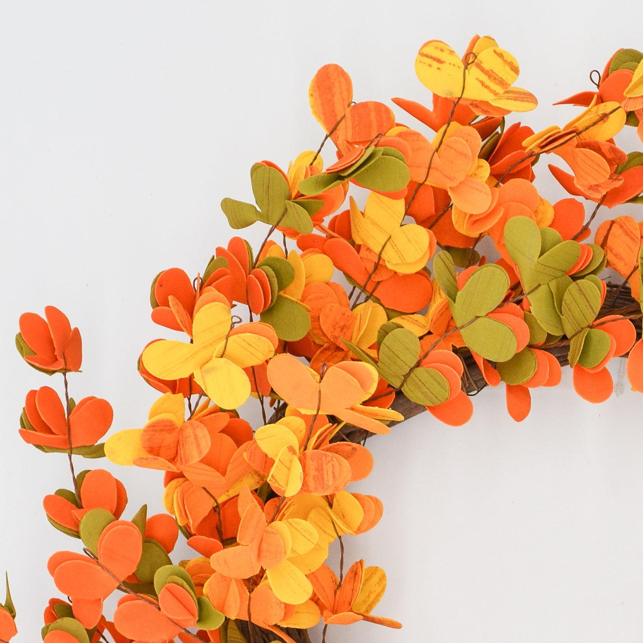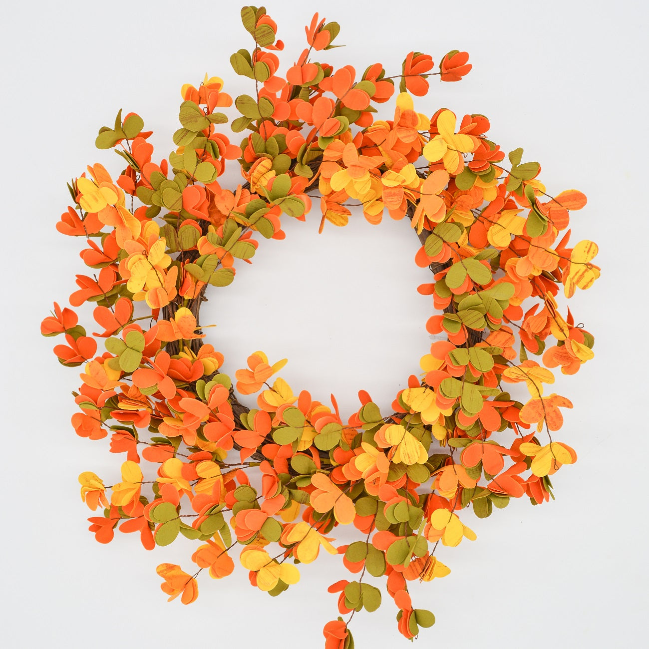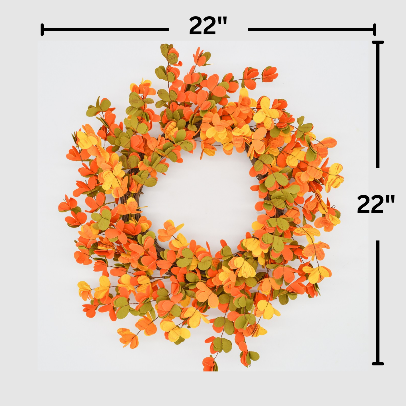 This 22" wreath is sure to add a cheerful touch to any fall decor. Handcrafted from a grapevine base and featuring an array of yellow, red, and orange clover accents, it's sure to make a statement with its bright and colorful design.
