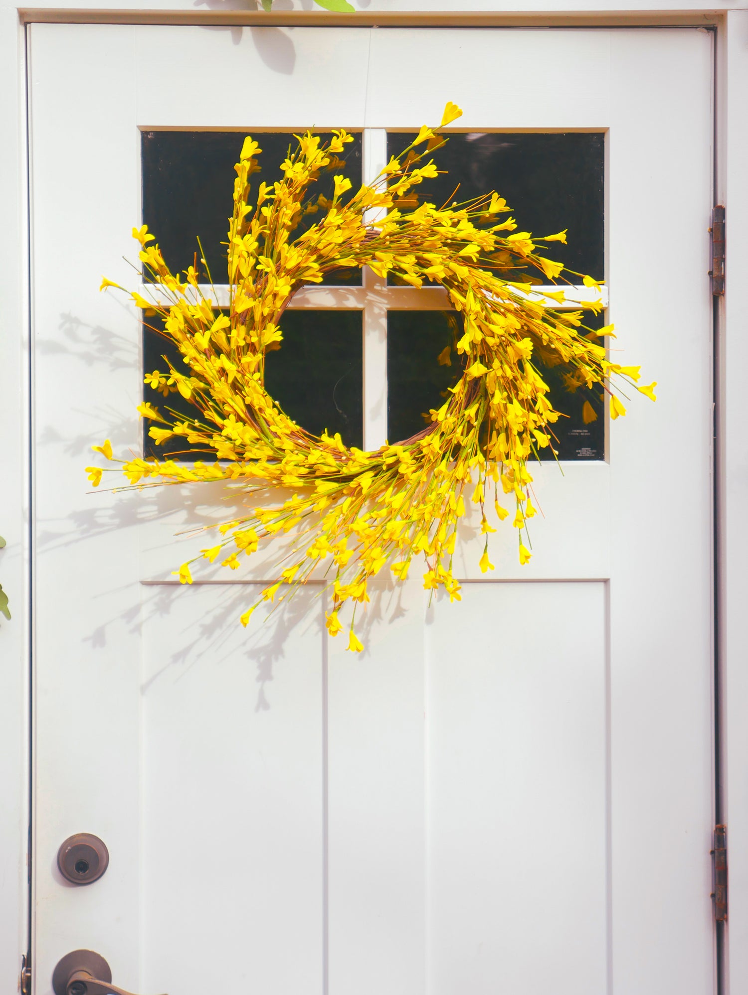 Add a pop of cheer to your front door with our 22" Yellow Forsythia Wreath. Perfect for spring, this dried artificial flower wreath will brighten up your space and welcome the new season with style. Say goodbye to dull decor and hello to a touch of playful charm!
