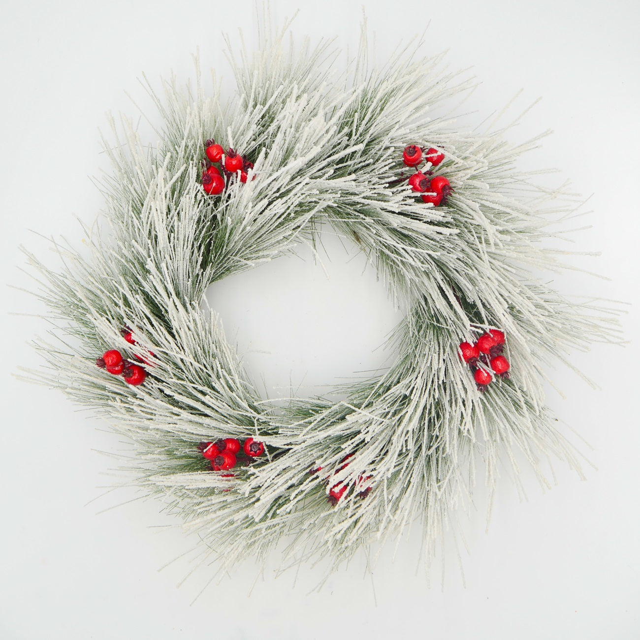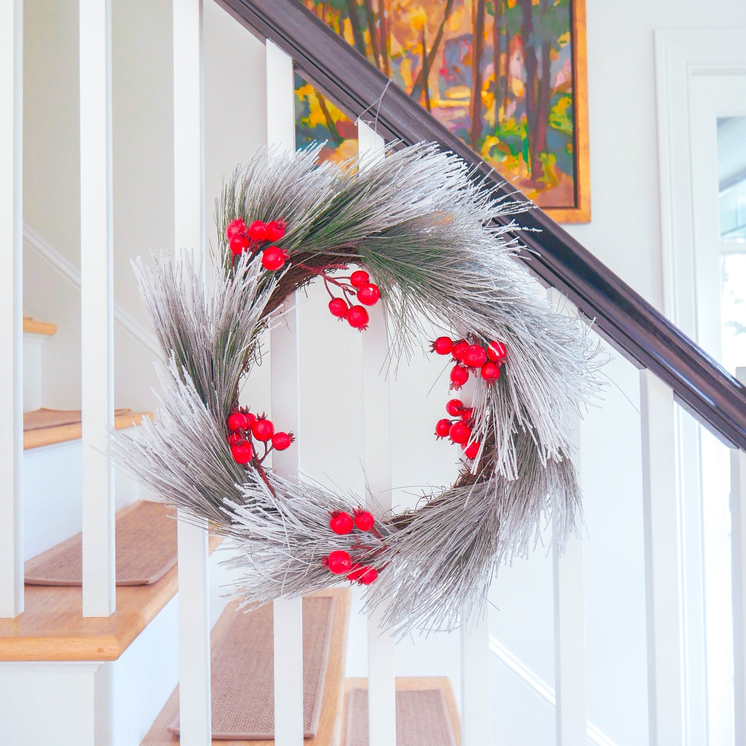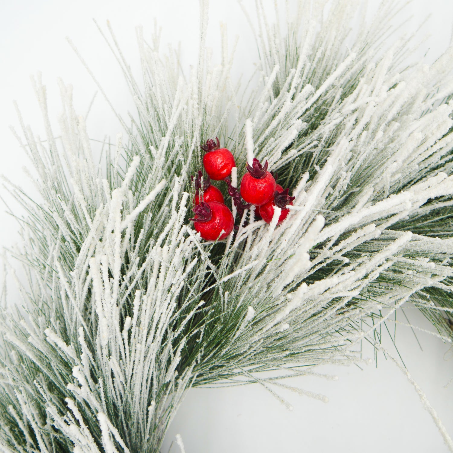 Introducing Floral Living's 26" Snowy Pine Holiday Wreath with Cherries - the perfect addition to your holiday décor! This expertly crafted wreath features snow-dusted pine foliage and pops of vibrant, crush resistant, red cherries. Add a touch of winter charm to any space with this beautiful and festive wreath.