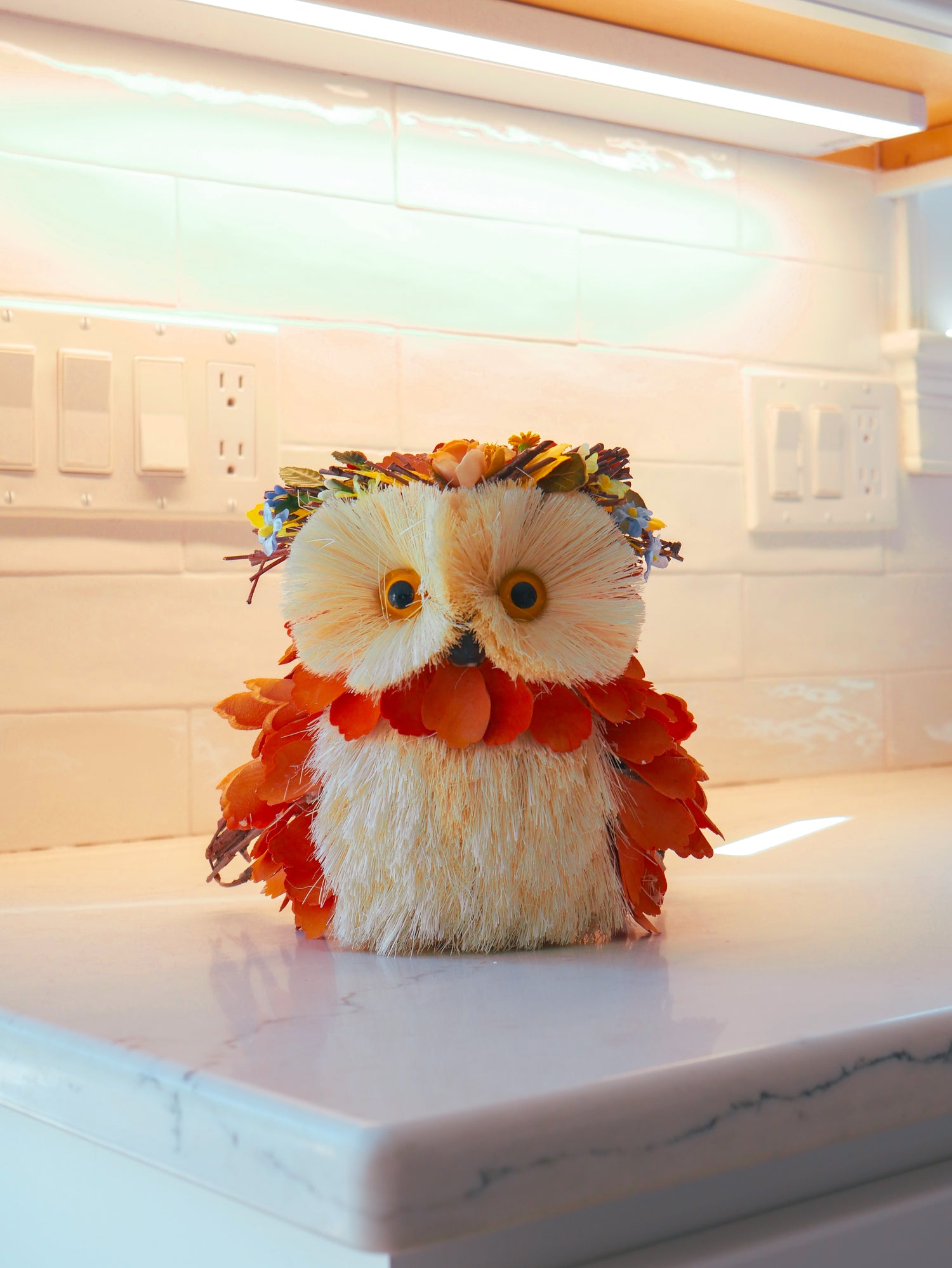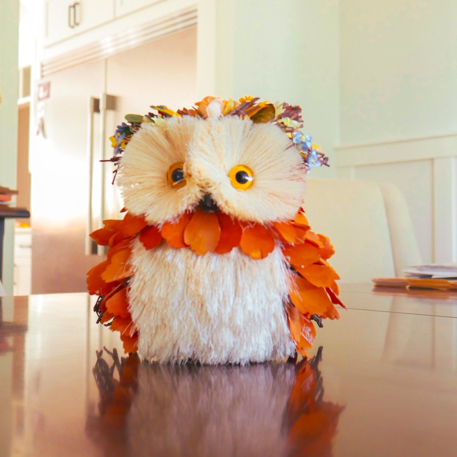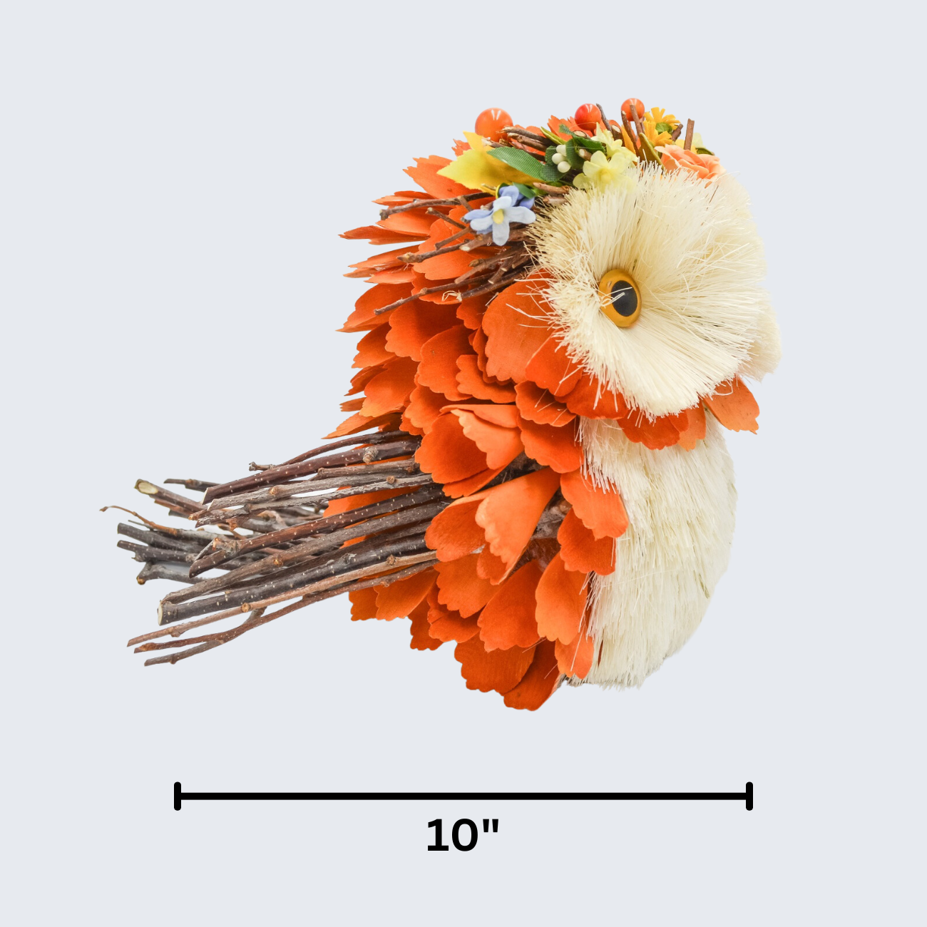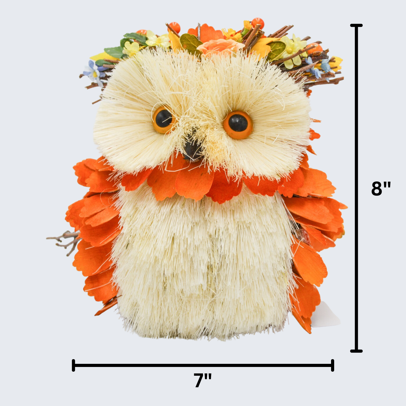 Bring a hint of autumn to any room with our 8" Harvest Owl. Crafted with sisal grass and wood, and featuring a beautiful floral crown, this orange owl is the perfect tabletop decor for any fall-themed home. Bring a bit of the countryside indoors!