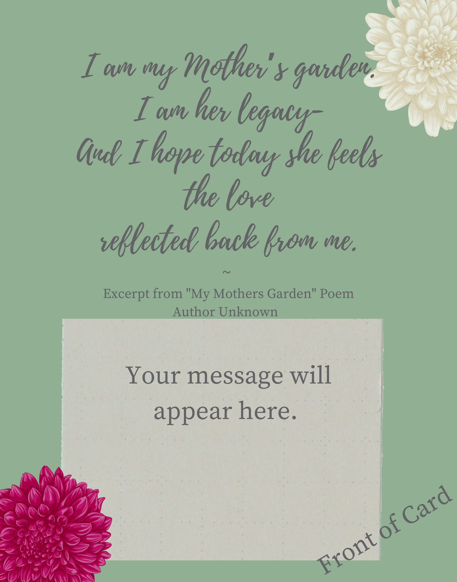 * This gift also includes a beautiful card with an excerpt from the poem "My Mothers Garden" and space for your custom gift messaging on the front and and explanation of the symbolism of Dahlias on the back.