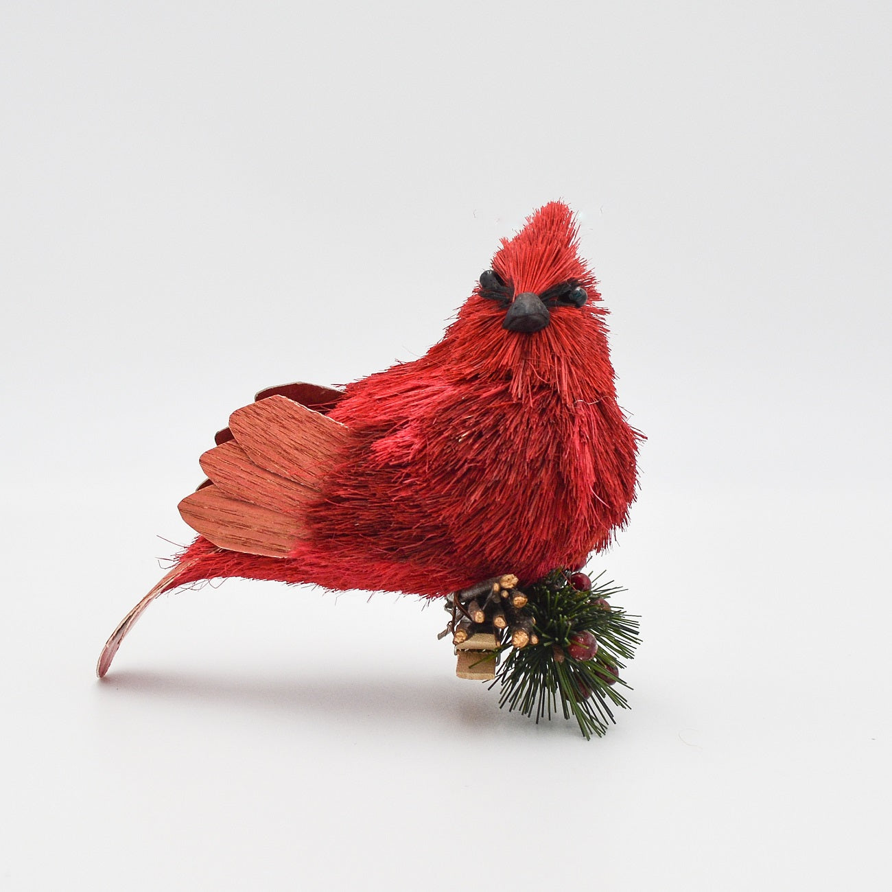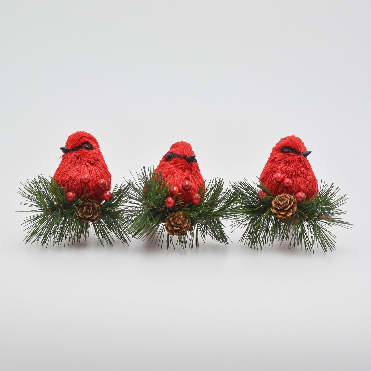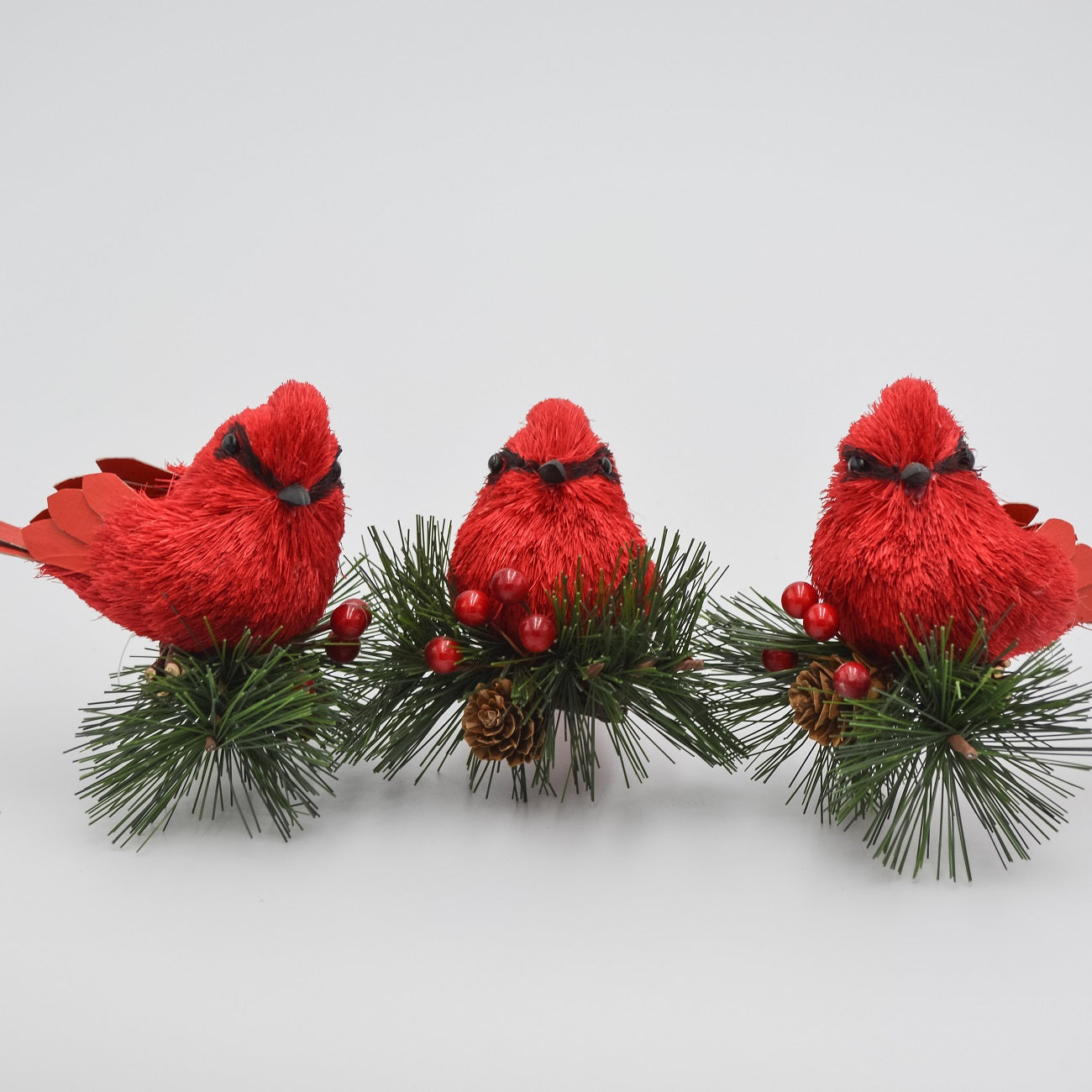 Set of 3, 5" Cardinal on Evergreen branch with clips.