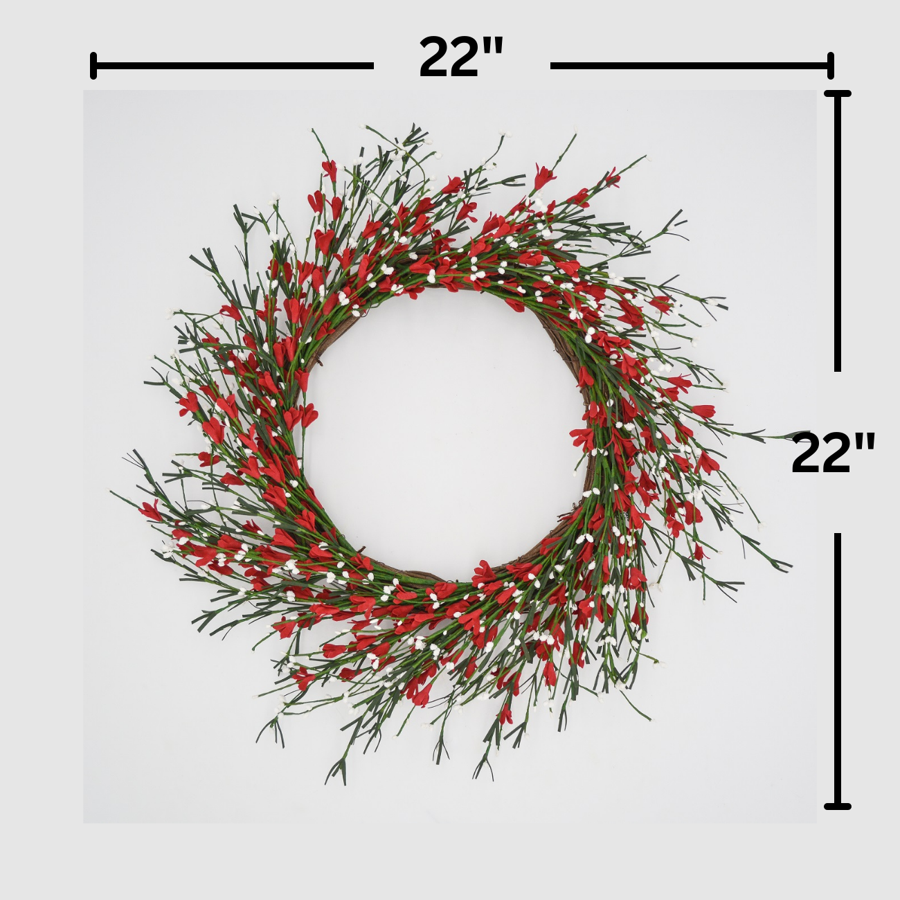 This 22" Holiday Red and White Buttercup Wreath is perfect for festive, winter decor. The wreath features beautiful, bright buttercups, bright white berries, and a classic farmhouse style, great for bringing the spirit of the holidays into any home.